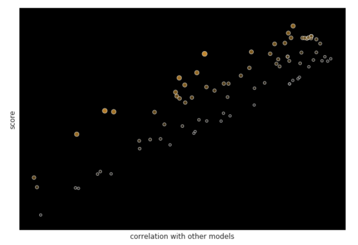 So a data scientist might first want to generate a handful of what she thinks are the most common types of models. Then she can write an optimization function that penalizes prediction-similarity to these models, and then use that new metric to iterate on her own pipeline to generate the predictions that she will submit. With this approach, she can construct a model that has a great chance of being extremely unique while also performing well on the dataset, and maximizing her payout.