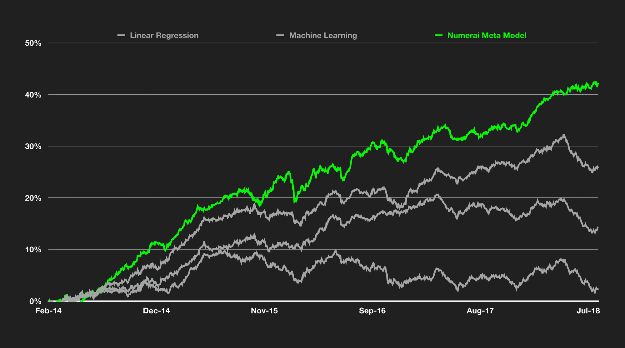 Getting all the technology and community in place to achieve Meta Model supremacy took years but adding the new data took months, and hundreds of brilliant data scientists modeling the new data took days. Meta Model supremacy puts us in a place where all we have to do is pour more data into the Numerai system and pose good problems and we will always be able to produce the best possible model on any given dataset.