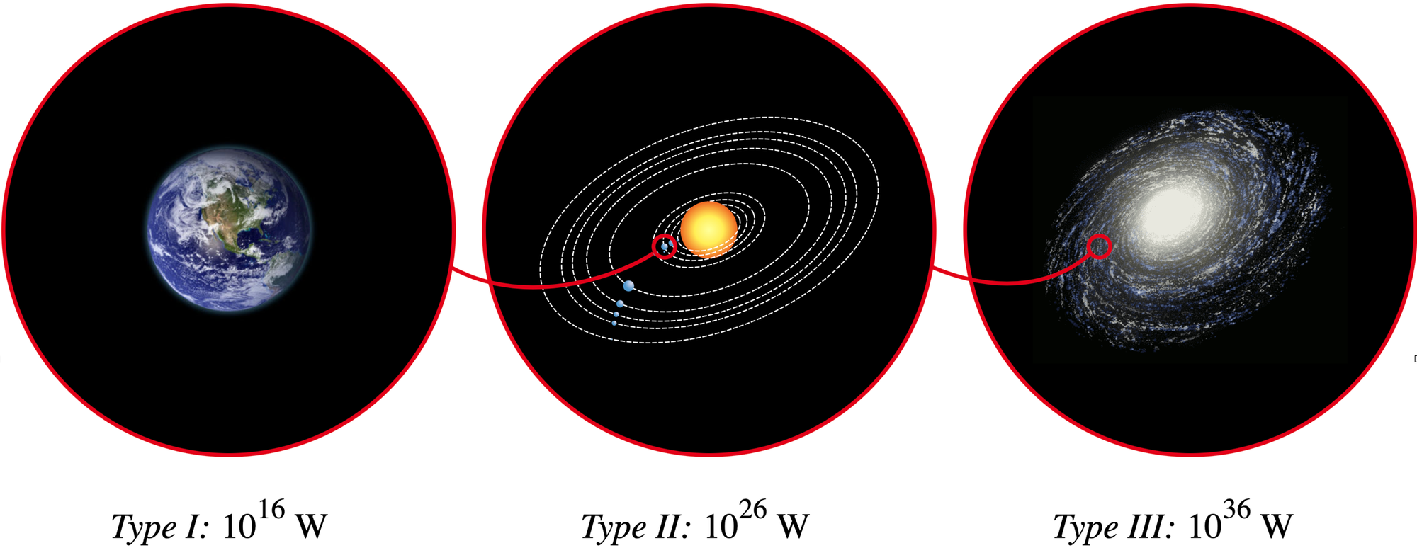 The Kardashev scale proposed by Soviet astrophysicist Nikolai Kardashev is a way to grade the technological advancement civilizations based on the energy they harness. A Type I civilization can harness all energy on its planet. A Type II can harness all the energy in its solar system whereas a Type III civilization can harness all energy in its galaxy.