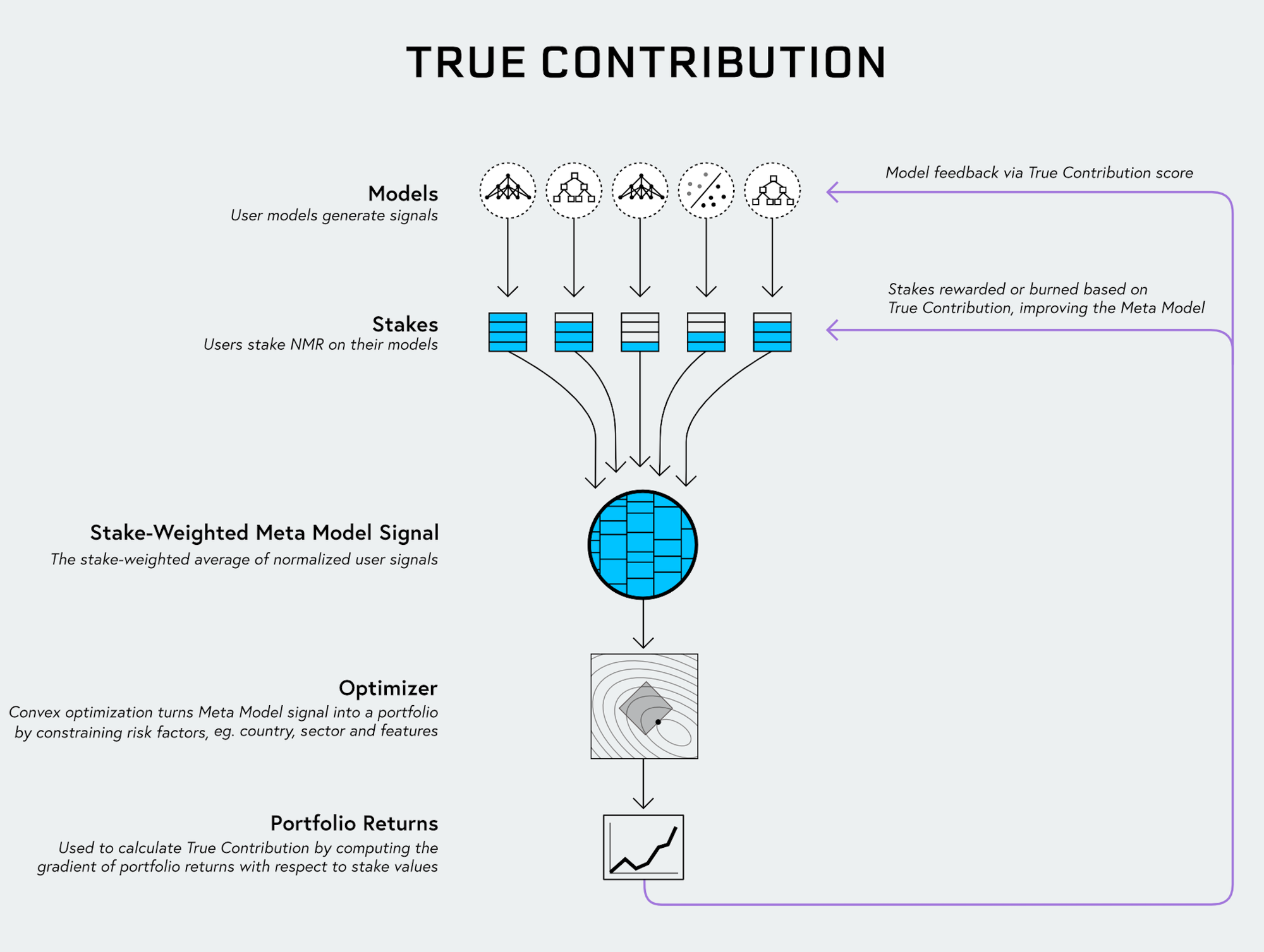 With True Contribution, Numerai is creating a feedback loop designed to continuously incentivize the creation and submission of signals which make profitable alterations to our hedge fund and disincentivize all other signals. Every round of Numerai will become like another pass of backpropagation on the overall cybernetic system of Numerai. Feedback and error correction propagate through a layer of distributed AI models, a blockchain staking layer, a Meta Model, and a convex optimization. In other words, with every round of Numerai we take a step closer towards becoming a Type IV hedge fund.