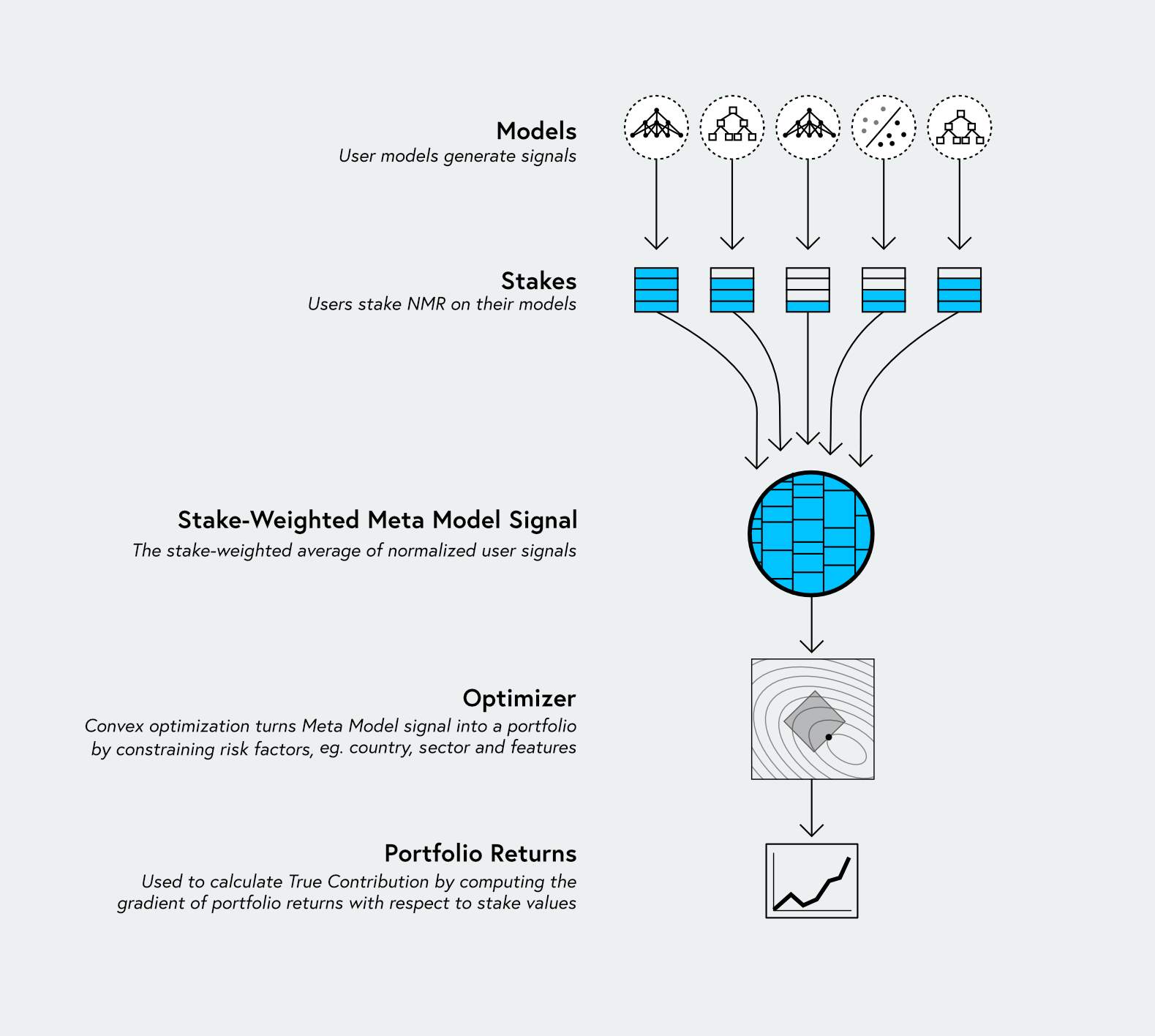As you can see in the diagram above, Numerai first combines the signals generated by data scientists’ machine learning models. We do this by computing the stake-weighted average of every signal to create the Stake-Weighted Meta Model. A data scientist who stakes a large amount of NMR on their model will have a larger weight in the Stake-Weighted Meta Model.