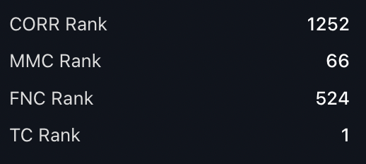 For example, there are many data scientists such as LANCE_A_LOT with very high True Contribution ranks but much lower ranks on other metrics such as correlation with the target. It’s clear that at least over the recent period, LANCE_A_LOT had a model that was helping Numerai the most but they were not rewarded properly for their contribution.