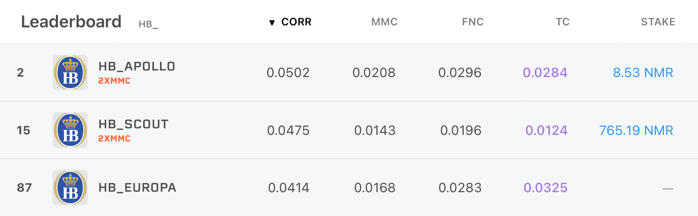 HB is an engineer at NASA Jet Propulsion Lab working on the Europa Clipper Mission, and a long time Numerai data scientist. HB has multiple models submitted to Numerai but the model he is staking the most NMR on (765 NMR worth $22,000) has much lower True Contribution than his other models. Some of his best models in terms of True Contribution have no stake on them at all meaning these excellent models have zero weight in the Meta Model and are not being rewarded at all.