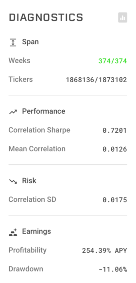 On Numerai Signals you can evaluate the originality of your signal on historical data as well. These historical diagnostics give fast feedback on the originality of your signal before you stake it.