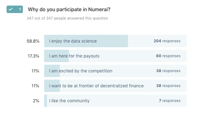In this first ever all-user survey, we learned a lot about the backgrounds, motivations, and preferences of the community. In particular, it became clear that we need to manage tournament changes better and do more to help onboard users to the dataset and data science problem.