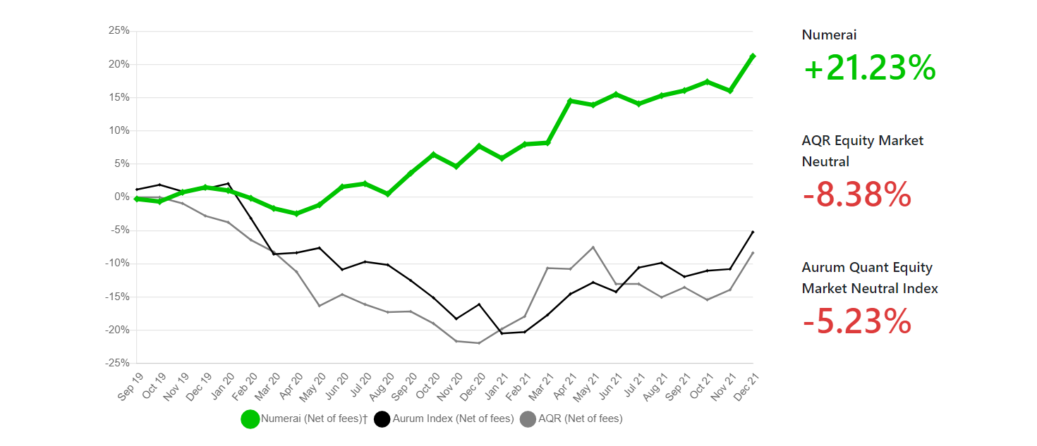 Since strategy launch in September 2019, Numerai is beating Aurum’s Quant Equity Market Neutral Index by 26.46% and AQR’s Market Neutral Fund by 29.61%***. Not bad for the last two years.