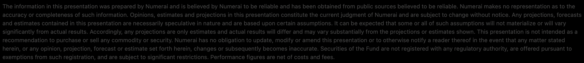 Performance results of Numerai’s hedge fund is presented for information purposes only. Numerai’s fund performance result was calculated net of management fee and incentive allocation, assuming a management fee at the rate of 1/12 of 1% (1% annually) of beginning net assets each month paid in advance and an annual incentive allocation calculated at a rate of 20% of trading profits. Rate of return is calculated by dividing net performance by beginning net assets. Performance of individual investors may vary based upon differing management fee and incentive allocation arrangements, and the timing of contributions and withdrawals. Returns are inclusive of the reinvestment of dividends and other earnings, including income from new issues. Returns may vary for investors who are restricted from participating in new issues. Performance results have been reviewed and audited by an independent accountant. The information provided is historical and is not a guide to future performance. Investors should be aware that a loss of investment is possible. No representation is being made that any investor will or is likely to achieve profits or losses similar to those shown.