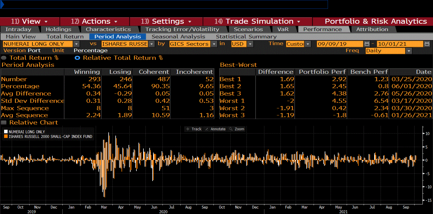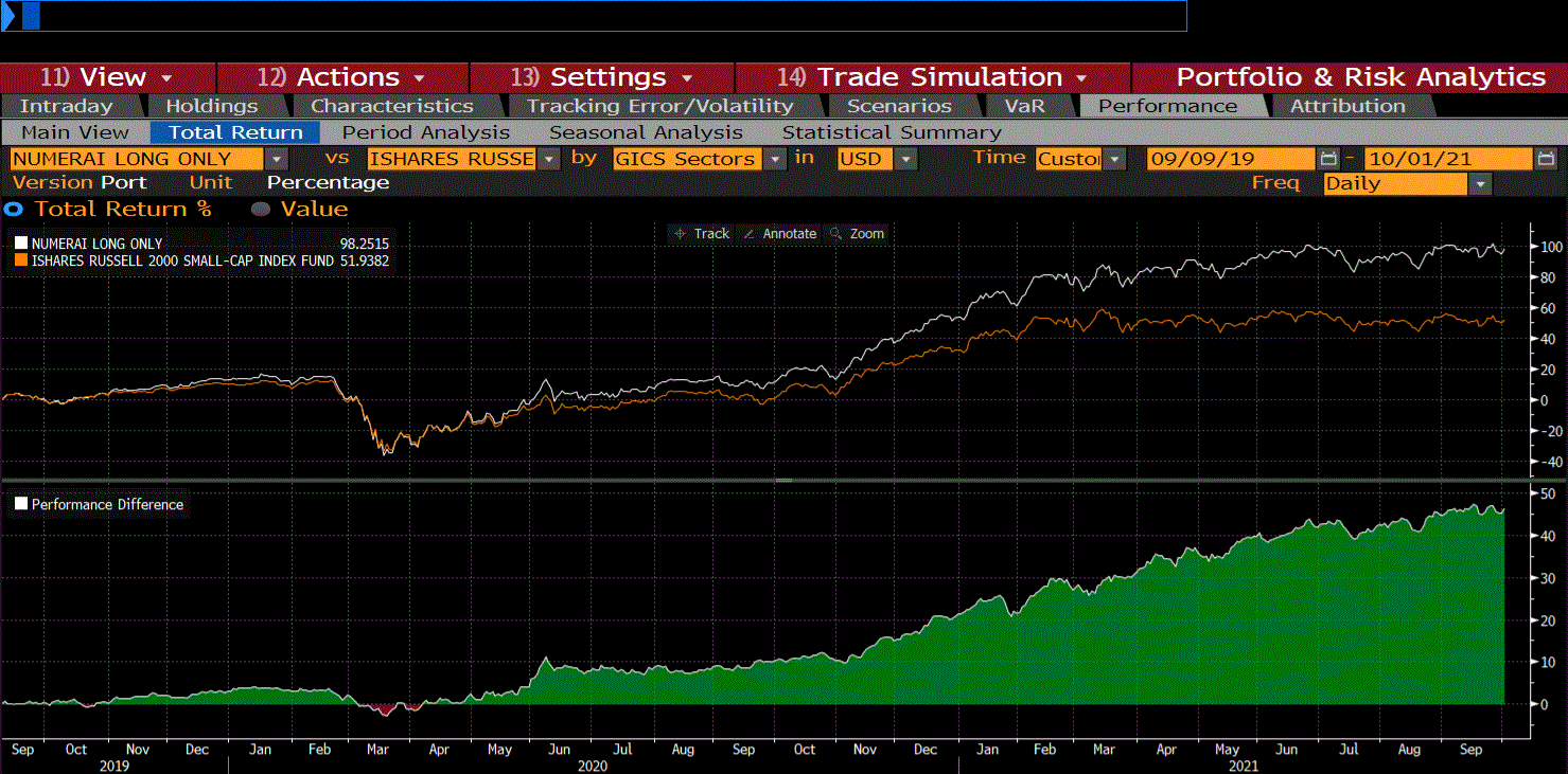 9/9/2019–10/01/2021 Numerai US Long Only: +98.25% iShares Russell 2000: +51.93% Numerai Outperformance: +46.32%