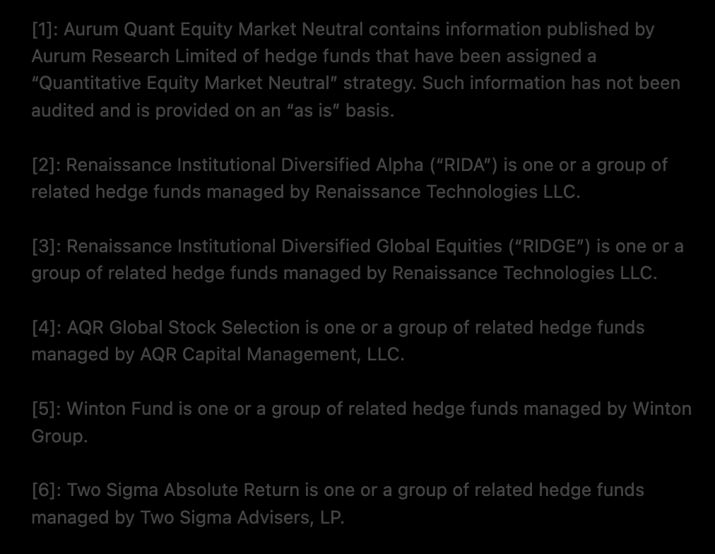 Aurum Quant Equity Market Neutral contains information published by Aurum Research Limited of hedge funds that have been assigned a “Quantitative Equity Market Neutral” strategy. Such information has not been audited and is provided on an “as is” basis.