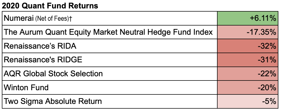 Yet Numerai’s market neutral hedge fund performed unusually well. Although 2020 was challenging, it allowed Numerai to differentiate itself from the blue chip quant hedge funds. It highlighted how risk exposed some of these older funds are. Many of these funds take large factor exposures which Numerai’s fund avoids.